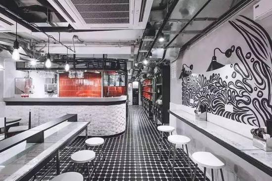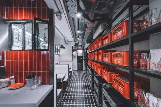 工业风的裸露管线、金属感的摆饰和灯具,摩登又时尚。加以十字牌牛奶的红色作为点缀,有种强烈的的视觉冲击效果。