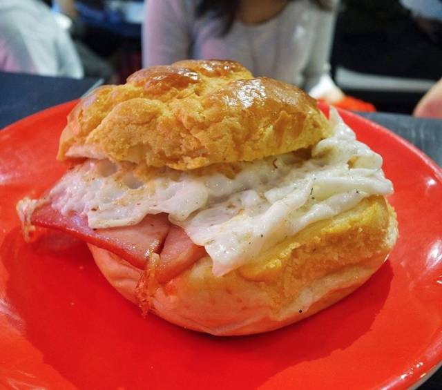 点了一份名字奇特的火腿爆蛋菠萝包,好奇它会如何“爆蛋”?待一勺下去,太阳蛋的蛋黄从菠萝包里爆开,不断地溢出,良久我才缓过神来。里面还有两片火腿,增添了菠萝包的食味。