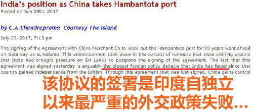 7月29日,斯里兰卡资深记者钱德拉普利马在该国网上论坛“Lankaweb”上撰文表示,中国租下汉班托塔港,对于印度而言或许是该国独立以来最严重的“外交失败”。