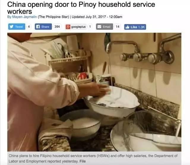 前不久,《菲律宾星报》报道称菲律宾劳动就业部发布一份关于中国打算聘请菲律宾家政服务人员前往中国北京、上海等5个大城市就业的报告,并承诺给予这些菲佣相对较高的工资,并表示目前双方正在研究为受聘的菲律宾家政服务员提供月薪人民币1.3万元的可能性。