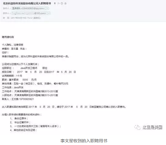 5月18日,“科蓝公司”电话面试了他,在问了许多专业问题后,这家公司用一个昵称为“五杀乐队”的个人邮箱给他发了offer,通知他去天津滨海高新区软件园报到。