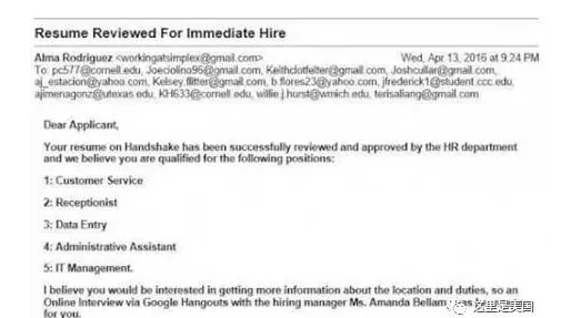去年4月,华人郭小姐在明州政府与就读大学网站上登录履历后,收到电子邮件通知,接着被要求用谷歌(Google)的在线聊天软件(hangouts)面试,经过在线面试两个多小时后,这名“假雇主”录用了她。