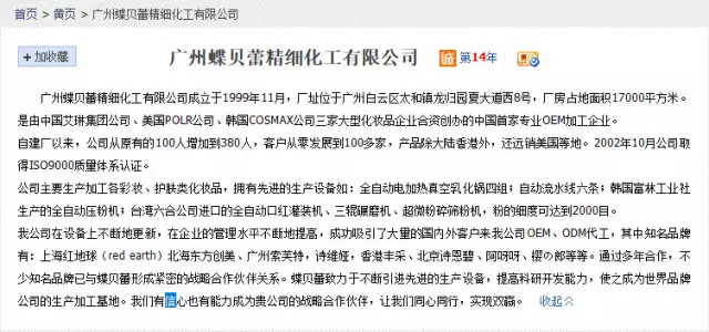 笔者在网络上发现一家名为“广州蝶贝蕾精细化工”的有限公司,与“蝶贝蕾”传销组织同名。官网介绍其成立于1999年11月,是由中国艾琳集团公司、美国POLR公司、韩国COSMAX公司三家大型化妆品企业合资创办的中国首家专业OEM加工企业。