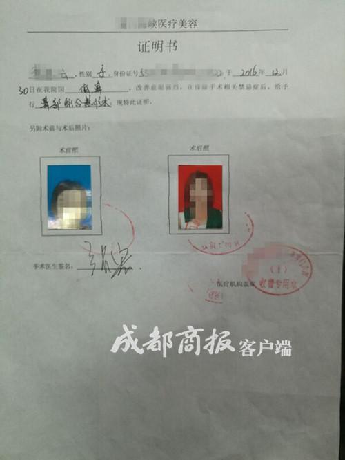 不得已,黄先生只有再次联系上厦门的整形医院,但该医院表示,此前给李雪做手术的医生已经辞职,黄先生又托朋友找到该医生的家,根据此前医院留存的手术资料,为李雪开具了一份“医疗美容证明书”。