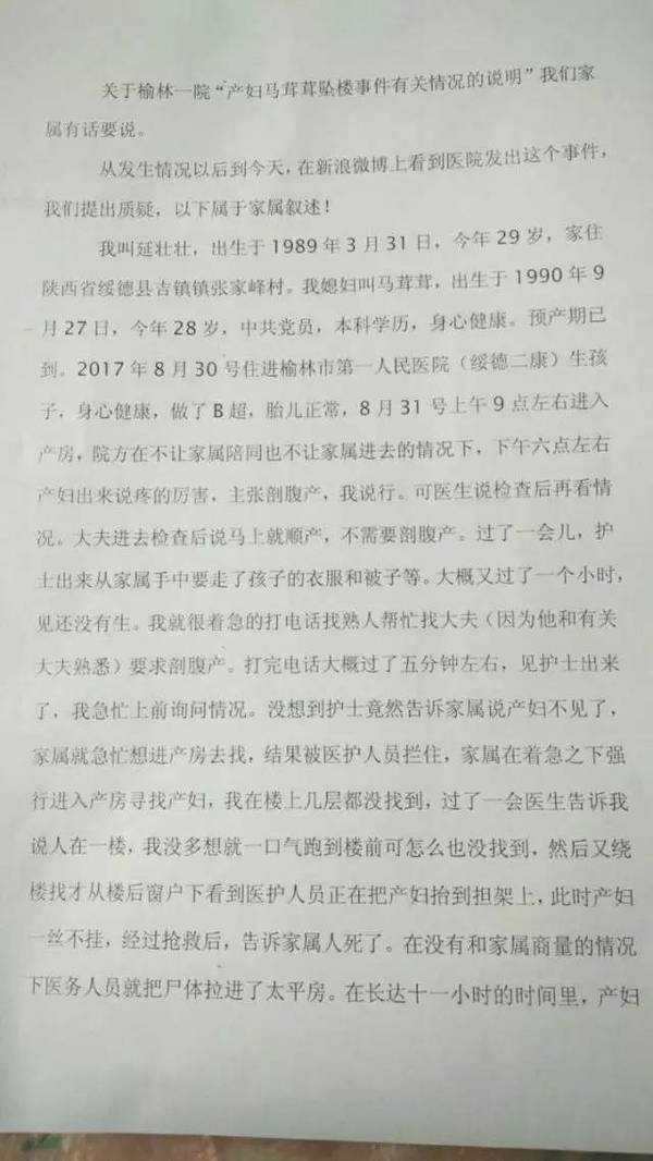 据媒体报道,榆林市第一医院发表声明称是因为家属多次拒绝实施剖腹产,最终导致产妇难忍疼痛、情绪失控跳楼。