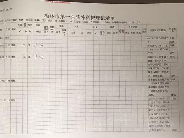 此外,榆林市第一医院提供的外科护理记录(即前述产程记录单)显示,8月31日17:30左右,产妇马某宫口近全,患者极不配合,要求剖宫产,给予心理安慰,同时给家属交代一次,家属表示理解,拒绝手术,继续观察;此后,当日18:05,患者自行走出待产房,经医护人员劝解后,由家属陪同送回产房,家属仍拒绝手术;当日19:19,患者仍不配合,再次走出待产房,再次由医护人员劝解后,产妇仍坚决要求剖宫产,家属仍拒绝手术,并陪同产妇送回产房。