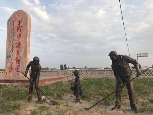 车子沿着弯弯曲曲的公路,向着井背塘驶去,公路两侧是零星的住户,再有就是苍苍茫茫直通蓝天的绿意。如果不是当地人提醒,很难想象,我们已经驶入了毛乌素沙地的腹地。直到一处一家三口正在植树的雕像,一侧的大石头上写着:“玉珍沙漠生态园”。