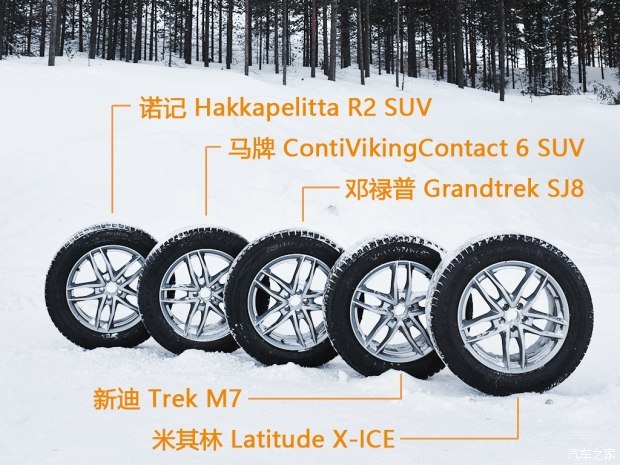 下文所有评价顺序依然按照拼音顺序排列:邓禄普(Dunlop)Grandtrek SJ8、马牌(Continental)ContiVikingContact 6 SUV、米其林(Michelin)Latitude X-ICE 2、诺记(Nokian)Hakkapelitta R2 SUV、新迪(Maxtrek)Trek M7,为了不让你读晕下文均简称为品牌名称。轮胎尺寸均为235\60 R18,原配这个尺寸轮胎的代表车型有沃尔沃XC60、现代胜达、传祺GS8等,当然现在遍地开花的各级别SUV还有很多轮胎尺寸,这次的测试可以作为参考。
