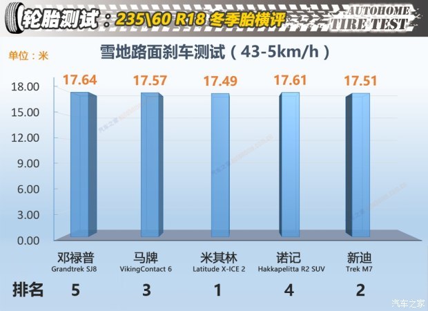 在刹车项目中5款产品的测试结果也相辅相成,米其林的表现最好,平均刹车成绩为17.49米,而横向来看,最好成绩和最差成绩之间的差距仅相差0.15米,相当于一个男性手掌的长度。水平相当这事儿是非常可喜的,毕竟刹车距离长短会直接影响到紧急情况下结果的好与坏,这雪地加速/刹车项目中给所有产品手动点赞。