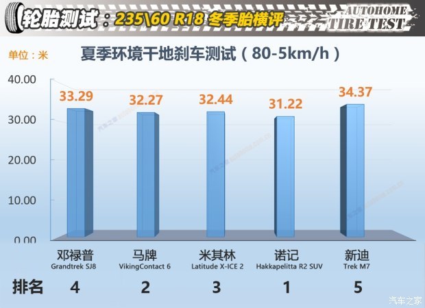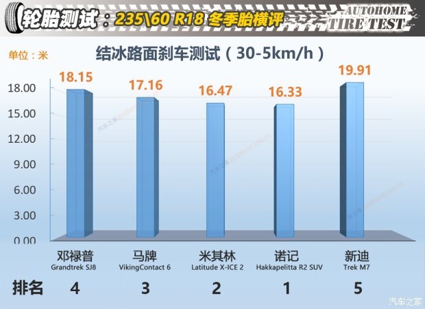 从结果来看5款产品在冰面上刹车成绩的差距远大于雪地上的差距,成绩最好的是诺记,刹车距离为16.33米,同它一样排在第一梯队的是米其林,成绩为16.47米,马牌和邓禄普的成绩为17.16米和18.15米,而成绩最差的为新迪轮胎,刹车距离为19.91米,与成绩最好的诺记轮胎相差3米半的距离,这相当于一辆微型车的长度,所以冰面刹车新迪轮胎的表现不尽人意。