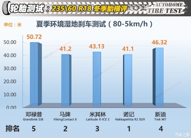 以上测试是在零上15℃左右的环境下测试的成绩,干燥柏油路环境下差距相对还比较小,不过这是建立在冬季胎的前提下的区别,如果换成四季胎,刹车距离长出几米距离也很正常;而在湿滑路面刹车测试中邓禄普出现了大幅度的退步,80-5km/h的刹车成绩超过了50米,比第一梯队的成绩多了9米的刹车距离。