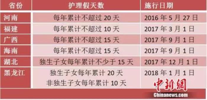 除了黑龙江,据不完全统计,此前,包括河南、福建、广西、海南、湖北等多省份已经明确独生子女护理假的天数。