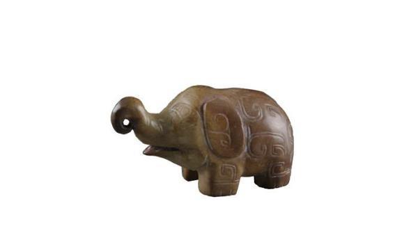 在西周中期(前10世纪中叶)之前,中原地区气候温湿,年平均温度比现代高,适合野象栖息。河南古称豫州,就是因出产大象而得名。古文献记载商人驯养大象,甲骨卜辞也有关于捕猎大象的记录。在殷墟多次发现象骨和象牙制品,在王陵区祭祀坑内还发现一只颈系大铜铃的亚洲幼象骨骸,证实了商人驯象的传说。这件玉象憨态可掬,夸张地表现了大象的驯服神态。