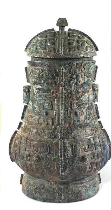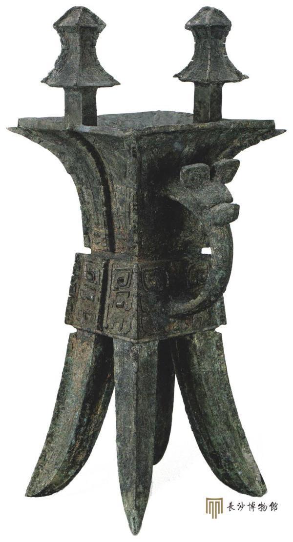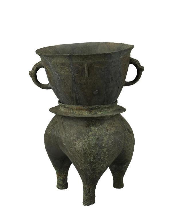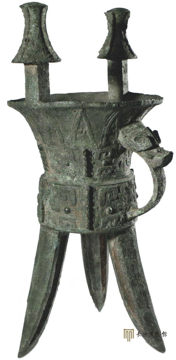 中国酒文化源远流长,所谓“礼以酒成”,酒器是中国古代最早的礼器之一。文献记载铜斝用以行祼礼,亦可滤酒,双柱可能用来悬挂滤酒网。此斝腹底中部铸铭文“妇好”,腹、足有丝织品残迹,鋬下有粗纺织品残迹,说明下葬时曾用多层织物包裹。如此高大的铜斝不多见,妇好墓随葬了8件大铜斝(含3件铜方斝)。