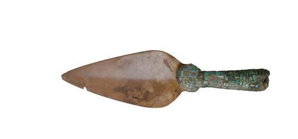 殷墟发现不少铜、玉复合器物,以兵器居多,或可称之为“金玉同盟”。这些复合兵器一般以玉为锋刃,说明不是实用兵器而是礼仪场合的仪仗用器。这件铜柄玉矛是铜玉复合兵器中的精品,突显了所有者的不凡身份。柄部镶嵌绿松石片,柄端与玉矛结合部巧妙地设计成蛇头形。玉质矛锋打磨极精。