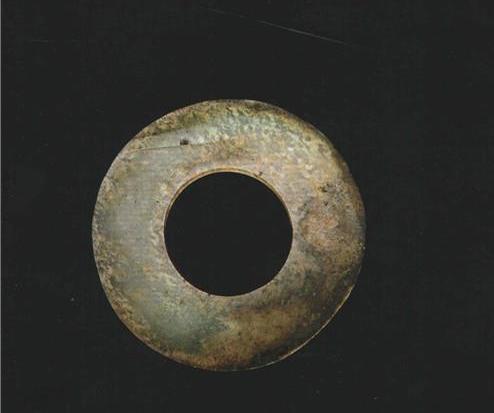 商周时期的玉璧小于新石器时代,壁面平滑,内外缘厚度相当,外缘边棱为圆角,两面对钻孔一般都很规整。商代有的玉璧被埋在宫殿宗庙基址的夯土下,用于奠基祭祀。妇好墓出土玉璧12件,有成组出现、大小依次递减的现象。