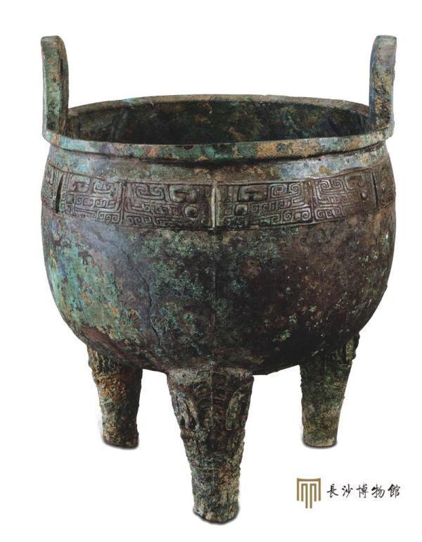 此鼎造型雄伟,深腹如半球,三柱足中空。口沿下饰六组兽面纹,口沿上有铭文“亚弜”二字。腹、足有烟炱迹,为实用之器。“亚”字是官职名称,“弜”是方国名或族名。武丁时期的卜辞记载了“弜”向商王入贡、为商王征伐等事。这件青铜鼎或是“弜”献给武丁夫妇的贡品,或是作为妇好葬礼的赗(助丧礼品)礼随葬。