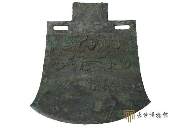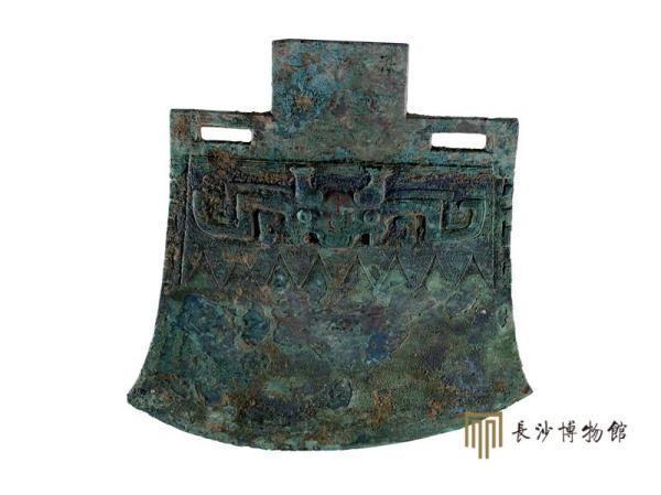 戈源自新石器时代的镰,极富农耕文化特色,是中国古代特有的兵器。戈出现于夏代晚期,一直使用至汉晋时期。戈的使用方式也与镰相似,主要以内刃勾、以尖锋啄。戈捆柄的部位称为内,锋刃部称为援。这件玉援铜内戈的内部饰兽面纹,镶嵌的绿松石大都已脱落。援的长度远远超过普通铜、玉戈,在礼仪场合十分威严。