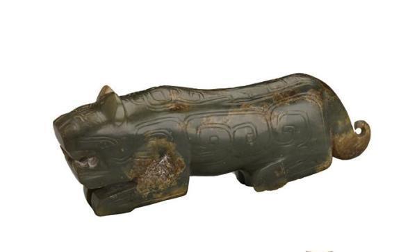 这件玉虎作行走状,身饰云纹。凶猛的老虎作为力量的象征,早在新石器时代已成为艺术创作题材。妇好墓随葬了8件玉虎,虽形态各异,但均张口露齿,气势逼人。这些玉虎有的可以穿绳随身佩戴,有的如这件玉虎则是摆件装饰。如此之多的玉虎伴随妇好身侧,益加彰显女虎将的威名。