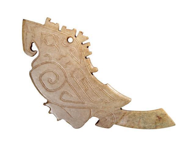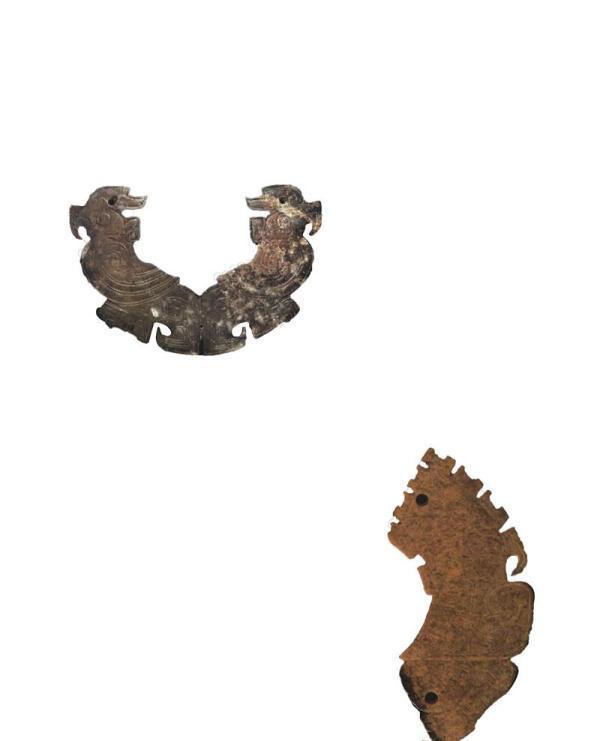 妇好墓出土21件钩喙有冠的鹦鹉形玉饰,也有观点认为应叫玉凤鸟。这件对尾玉鹦鹉较为罕见,可能象征神鸟,也有可能是以当时的透视法表现一只鹦鹉的两个侧面。两尾相连处有小孔,可穿绳佩戴。