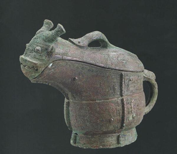 妇好墓出土铜觥八件,包括圈足和四足两种形制。此觥盖首为虎头兽面纹,盖尾兽面纹似鸮(xiāo,猫头鹰)。盖与器身扣合后,正视为一蹲坐的虎,后视为一站立的鸱鸮,造型独特,设计精巧。器底中部铸铭文“妇好”。