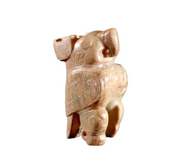 早在史前时期,猫头鹰已被中国先民视为祥瑞神鸟,这一传统延续到了商代。但从西周中期之后,猫头鹰开始被斥为恶鸟。这件玉鸱鸮呈站立状,尾与足之间有槽,足下两侧各有一个未钻穿的小孔,头顶后有一上下对穿的小孔,可插嵌亦可佩戴。