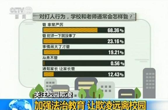 对于打人等暴力行为,学校和老师会怎样管呢?央视记者曾对177名直接或间接参与过校园暴力的学生进行了问卷调查,68%的学生选择“管而且非常严厉”,23%的学生选择“管但批评一下就没事儿了”,19%的学生选择“事情闹大了才会管”。