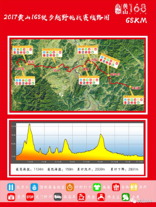 专业组:越野线路总长68公里,线路总爬升2609m;总下降2801m:,赛道32%为硬化路面,68%为越野步道,赛道除途径上面特色景点还经过徽池古道,桃林,古村落等景观。