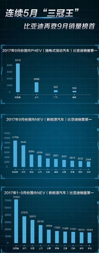2015年、2016年比亚迪连续两年获得新能源车销量第一;2017年1-9月比亚迪新能源车销量继续排名榜首。