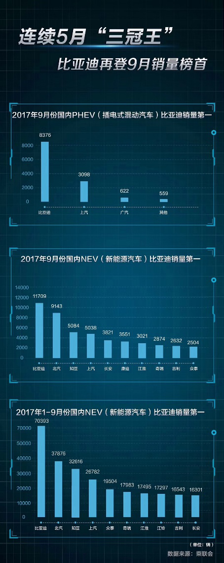 2015年、2016年比亚迪连续两年获得新能源车销量第一;2017年1-9月比亚迪新能源车销量继续排名榜首。