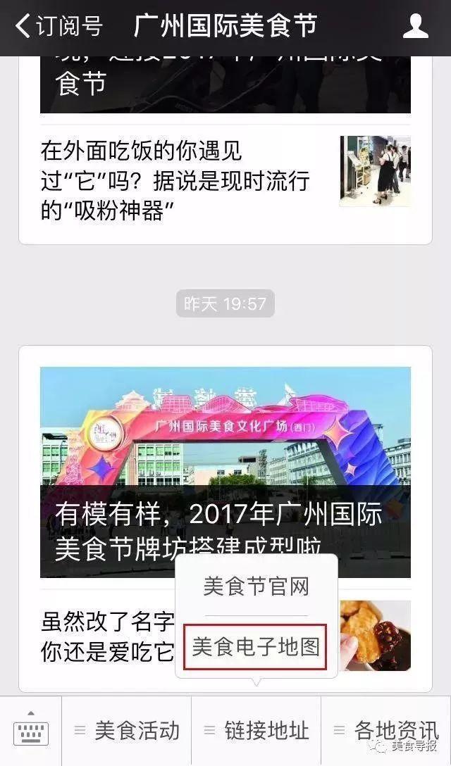 活动期间,只要关注“广州国际美食节”微信公众号,即可获得“番禺美食地图”,美食节活动现场的美食集聚区及各食肆酒楼的景观,各类美食菜式,美食文化和特色,现场各个摊位的详情介绍,通过手机就能查到,一目了然。