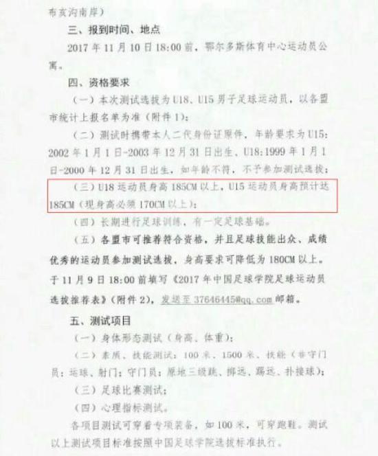 没想到这些话语如今却一语成谶,现在已被白纸黑字地印刻在内蒙古足协下发的《关于中国足球学院来内蒙古自治区进行测试选拔的通知》,根据《通知》选拔人才规定的第三点:“适龄运动员的身高要达到185cm。(U18身高要185以上,U15要170以上)。”