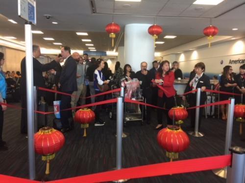 为吸引中国游客,美国洛杉矶一航空公司不仅用中文指示标,还在机场柜台悬挂红色绸缎彩带,登机口周围还悬挂着红色灯笼,场面极具有中国特色。