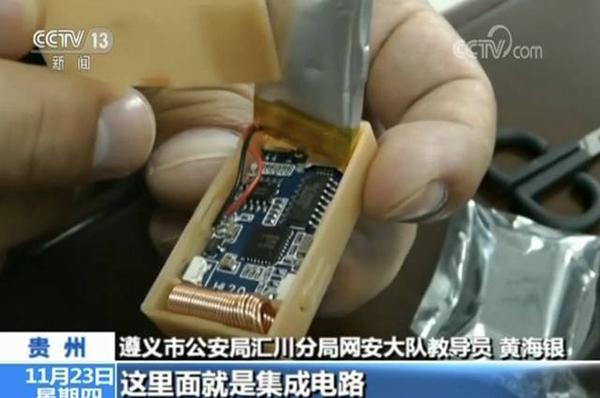 民警介绍,所谓的网售作弊器材,主要就是一台国家明令禁用频段的信号发射器,和一个经过伪装后方便考生带入考场的“橡皮接收器”。该接收器里面有电池,有线圈,是一个完整的集成电路。