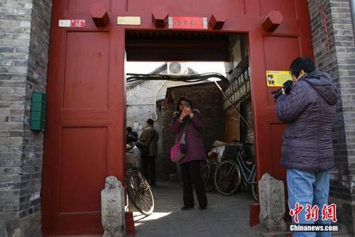 资料图:2月27日,游客在南锣鼓巷雨儿胡同30号前拍照留念。中新社发 熊然 摄