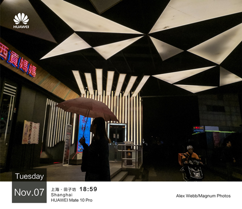 当然除了快速的对焦表现是街拍摄影师关注的因素之外,精准的曝光水平同样影响了一张照片的好坏。Alex这张照片选择了拍摄剪影效果来表现消费主义浪潮下的普通人群。为了还原他脑海中的画面,照片中的人物则需要通过一定程度的欠曝才能够和背景的海报形成强烈反差。以往拍摄这类作品是,如果手机的宽容度不够,画面中人物脸部的位置极易出现所谓的“死黑”现象,但这将会失去人物面部表情等细节。而HUAWEI Mate 10 Pro搭载了AI芯片麒麟970以及双ISP图像处理引擎,因此在画面中可以保留到更多的暗部细节,同时抑制高光溢出等现象,使得画面具有绝佳的动态范围。这保证了摄影师可以调整出心中理想的曝光值,从而还原出他想要的“决定性瞬间”。
