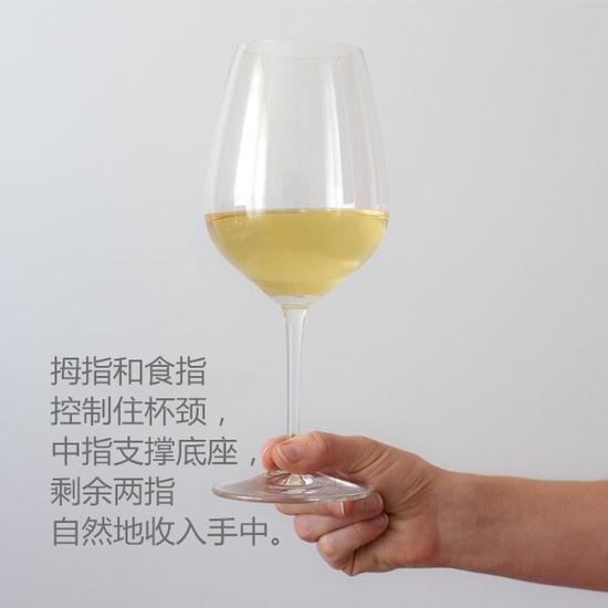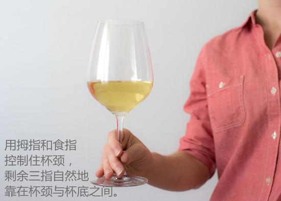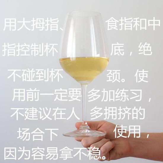 在对专业度要求较高的场合,像是专业的品鉴会等,你可能会看到人们这样拿杯子。之所以这样持杯,有两方面的原因:一是因为人体的平均体温36.5℃,远高于红葡萄酒的适饮温度15~18℃和白葡萄酒的适饮温度7~10℃,手离杯壁越远,体温对酒口感的影响越小;二是因为如此拿酒杯,杯壁周围没有任何遮挡,可以更好地看清酒液颜色。
