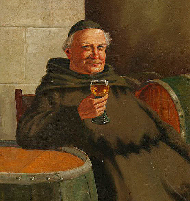 在一个以“僧侣和酒”为主题的系列油画中,唐·培里侬红扑扑的脸颊看起来像是喝醉了一样,但是拿着香槟杯的那只手,还是极克制的放在杯杆上,不忘向大家传授“拿起一杯香槟的正确姿势”——