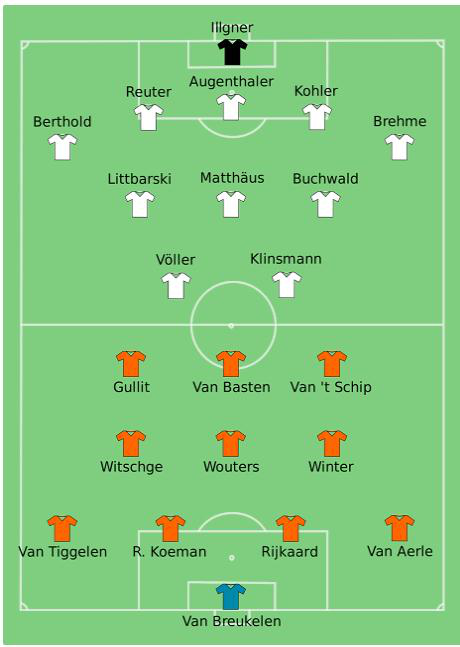 大战来临之前,“皇帝”贝肯鲍尔潜心研究荷兰队的录像寻找破绽。荷兰三剑客的中轴线实在太强大,贝肯鲍尔祭出532阵型,奥根塔勒,科勒和罗伊特作为3中卫,布雷默和贝特霍尔德踢翼卫,中场3人为利特巴尔斯基、马特乌斯、布赫瓦尔德,双前锋为克林斯曼和沃勒尔。