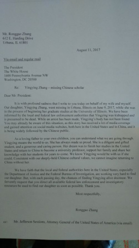 请愿信信中写到:“作为一个疼爱自己子女的父亲, 你(特朗普)应该可以明白我们正在经历的痛苦。我们十分希望你(特朗普)能指示所有能动用的联邦侦探及执法资源,帮助尽快找到我们的女儿章莹颖。”