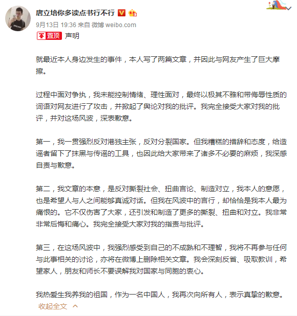 【环球网综合报道】9月13日晚7时许,曾辱骂同胞是“支蛆”的四川泸州高考状元唐立培在微博上再次发布一封致歉声明,称强烈反对“港独”主张,反对分裂国家,并表示自己热爱祖国,“作为一名中国人,再次表示歉意”。