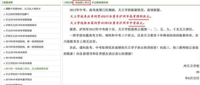 但如今,只剩2人的名字。虽然文中的措辞仍然是:“一所学校包揽高考文科、理科和中考三个状元,这是天立教育十年铸剑创造的崭新传奇,在川南教育史上绝无仅有。”