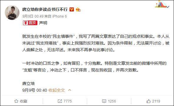 微博ID为“@唐立培你多读点书行不行”的账号9月9日凌晨发消息称,自己就发生在香港中文大学的“民主墙事件”写了两篇文章表达观点和事实,但从未说过“我支持港独”,事实上强烈反对“港独”。因为条件限制,无法展开讨论,被人曲解之处,无法尽述。未来我不再参与此事讨论。