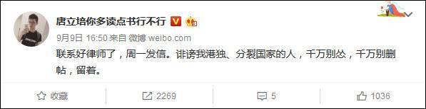 此前的9日下午,@唐立培你多读点书行不行发布微博称,对于诽谤自己“港独”、分裂国家的言论,已联系律师。