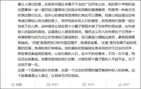 “最让人难过的是,在受到中国社会看不下去的广泛抨击之后,他的那个声明的说法里哪有一丝一毫对自己羞辱自己的故乡和同胞的羞愧悔恨,而是用一种官方式的表达敷衍过去。他内心的感受我觉得我们其实可以理解。他真心地丝毫也没有考虑过曾经以他为傲的家人、同学和故乡的人们的感受,他觉得他们就是一些比他低下的人群。这种感觉让他在那个小圈子里既失掉了对世界的现实感,也失掉做人的起码的底线。这真是让人感到悲哀的。 殖民主义对人的伤害在于它用来一种潜移默化的方式让你觉得自己是低贱的,自己要奋力摆脱这感觉,要表现得更极端些。‘你国’就是把自己和中国区隔开,免得受连累。‘支蛆’是对他看不起的同胞的区隔,免得和他们有牵连。 他的偏执和极端其实是来自他对于过去的厌弃,那些曾经真诚地欣赏他,以他为傲的人们,在今天的他看来,不仅一文不值,而且还在拖累他。他要彻底地和他们切割,才能和那个圈子里的人平起平坐,为了这他不惜一切。