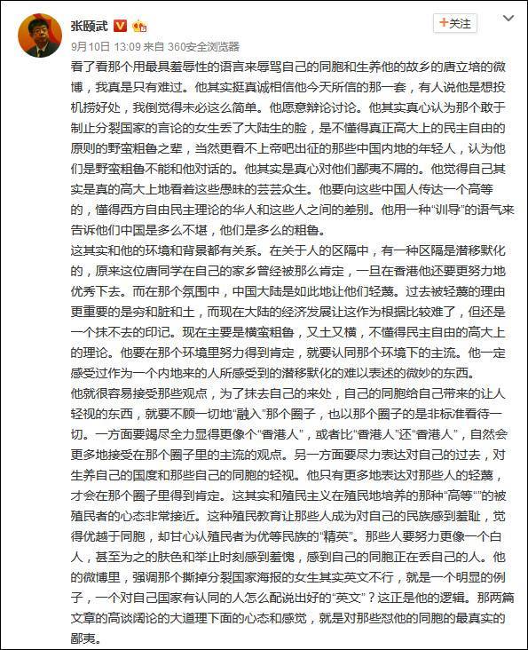 对此,北京大学中文系教授张颐武也于昨天(10日)在微博发表长文,“看了看那个用最具羞辱性的语言来辱骂自己的同胞和生养他的故乡的唐立培的微博,我真是只有难过”,“(唐同学)要不顾一切地‘融入’那个圈子,也以那个圈子的是非标准看待一切。一方面要竭尽全力显得更像个‘香港人’,或者比‘香港人’还‘香港人’,自然会更多地接受在那个圈子里的主流的观点。另一方面要尽力表达对自己的过去,对生养自己的国度和那些自己的同胞的轻视。他只有更多地表达对那些人的轻蔑,才会在那个圈子里得到肯定。这其实和殖民主义在殖民地培养的那种“高等”的被殖民者的心态非常接近。”