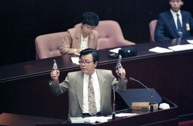 电击棒、催泪瓦斯算神马,这儿还有手枪呢!1993年,“立委”赖英芳拿着手枪道具质询,可是让大家“吃了一鲸”。