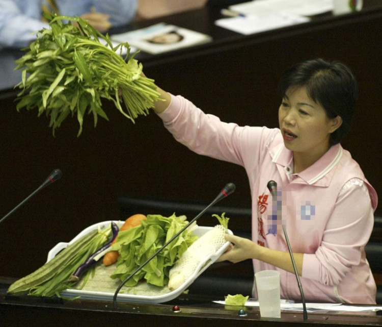 2007年,国民党“立委”杨琼璎向时任“行政院长”的张俊雄质询菜价时,把各种青菜端上备询台,一个个质问菜价。