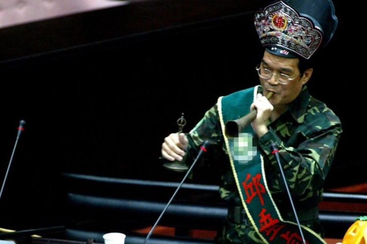 民进党“立委”邱垂贞当年质询时身穿迷彩服,头戴道士帽,拿起法器表演抓鬼秀。(图片来源:台湾《联合报》)