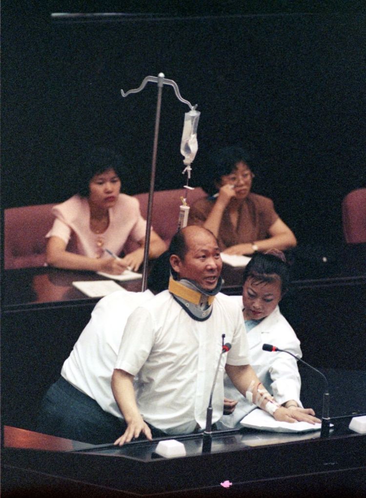 同年,核四预算案引发的朝野流血冲突持续蔓延,“立法院院会”在两党“立委”相互指责、谴责暴力中进行。“立委”施台生打点滴由护士陪同上发言台,批评对手为政治目的,利用全台资源制造社会矛盾,是人格分裂。